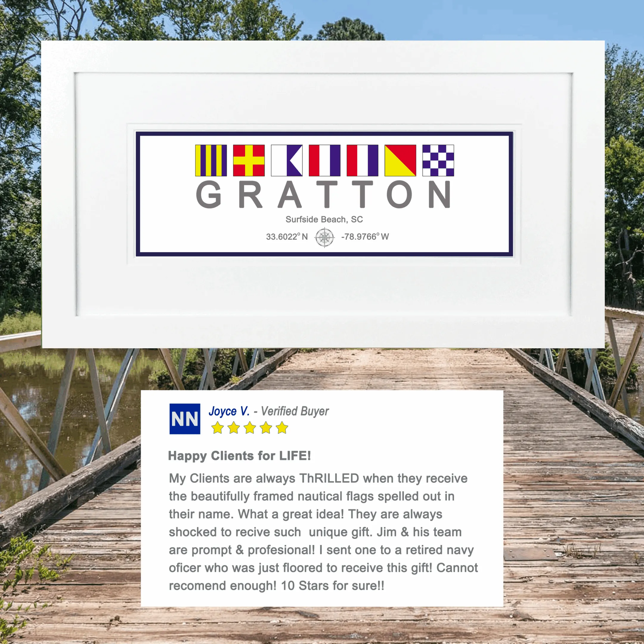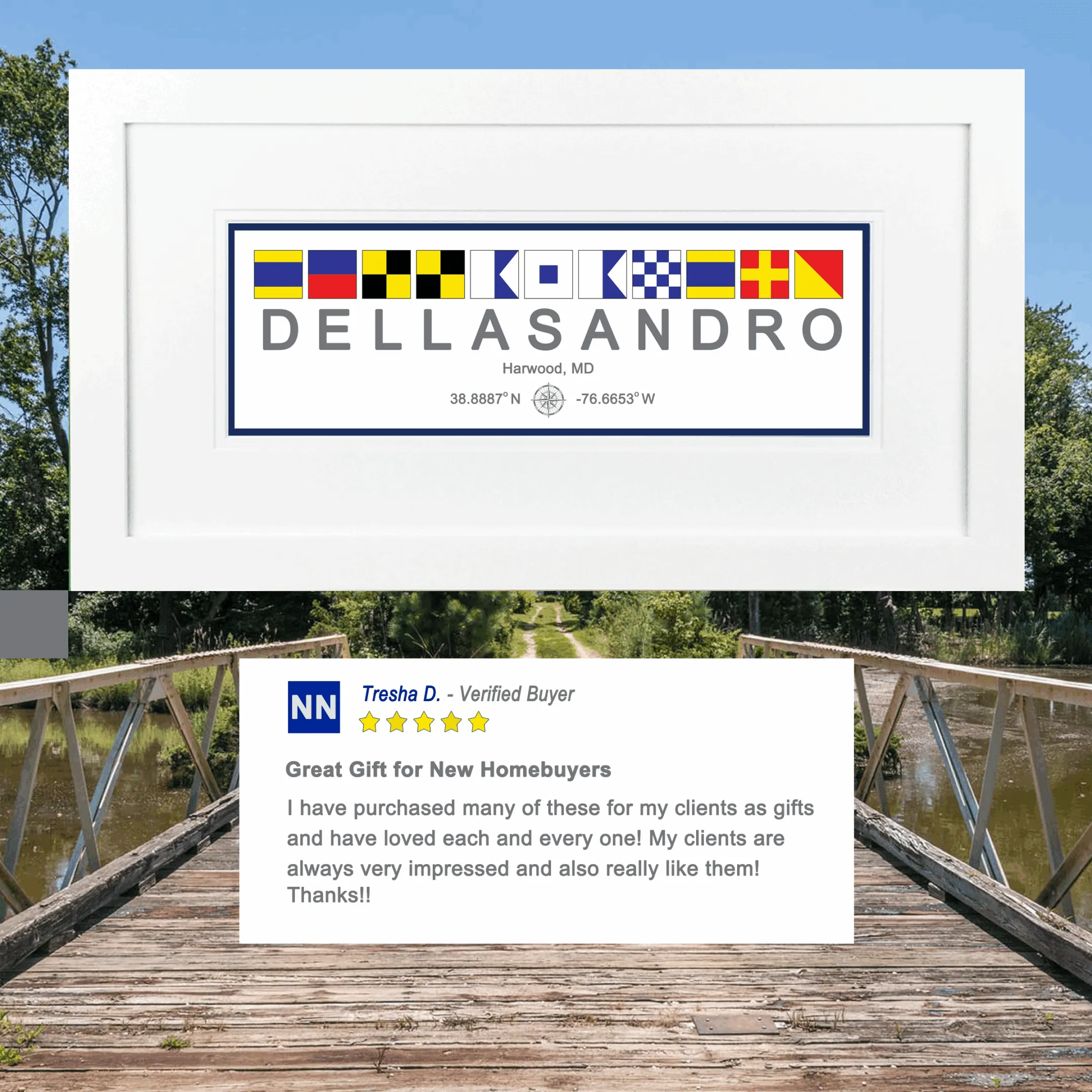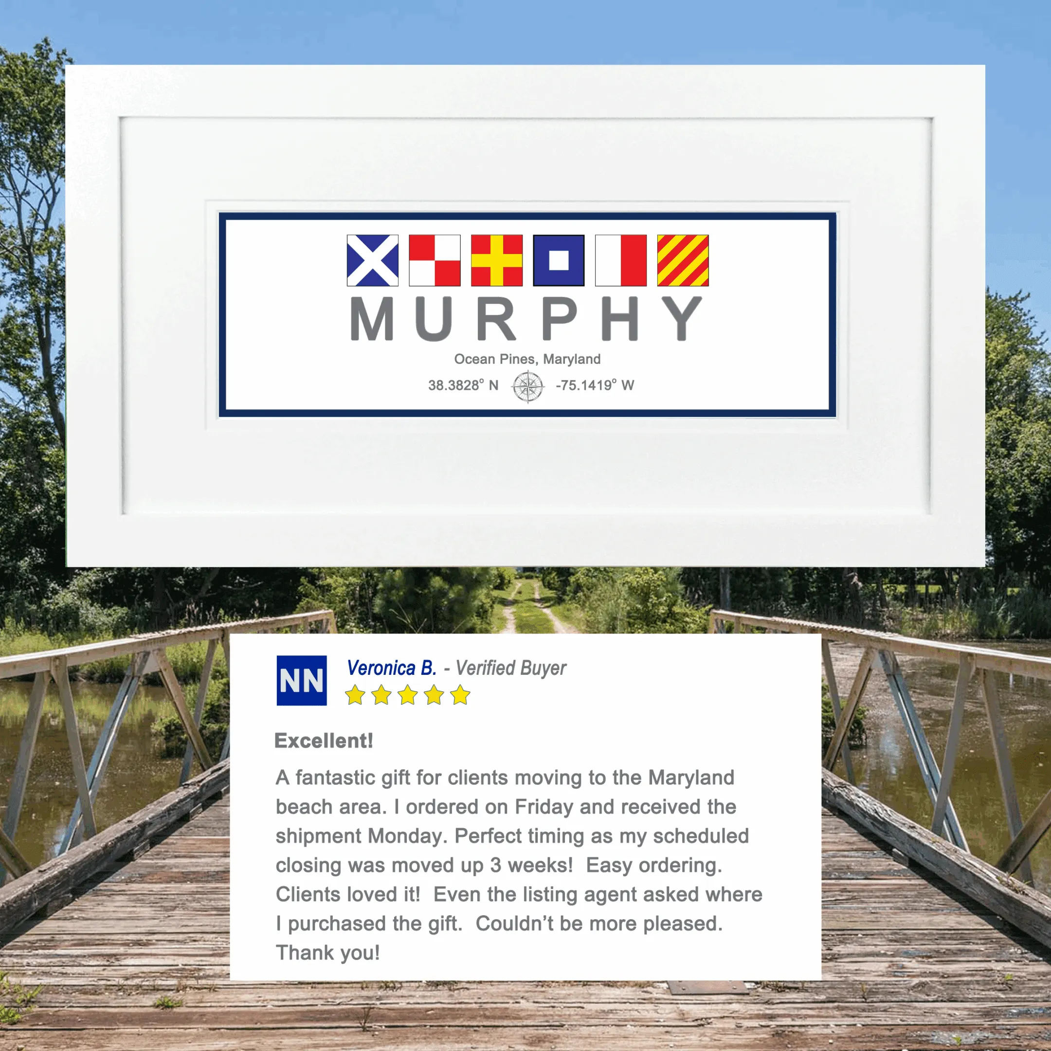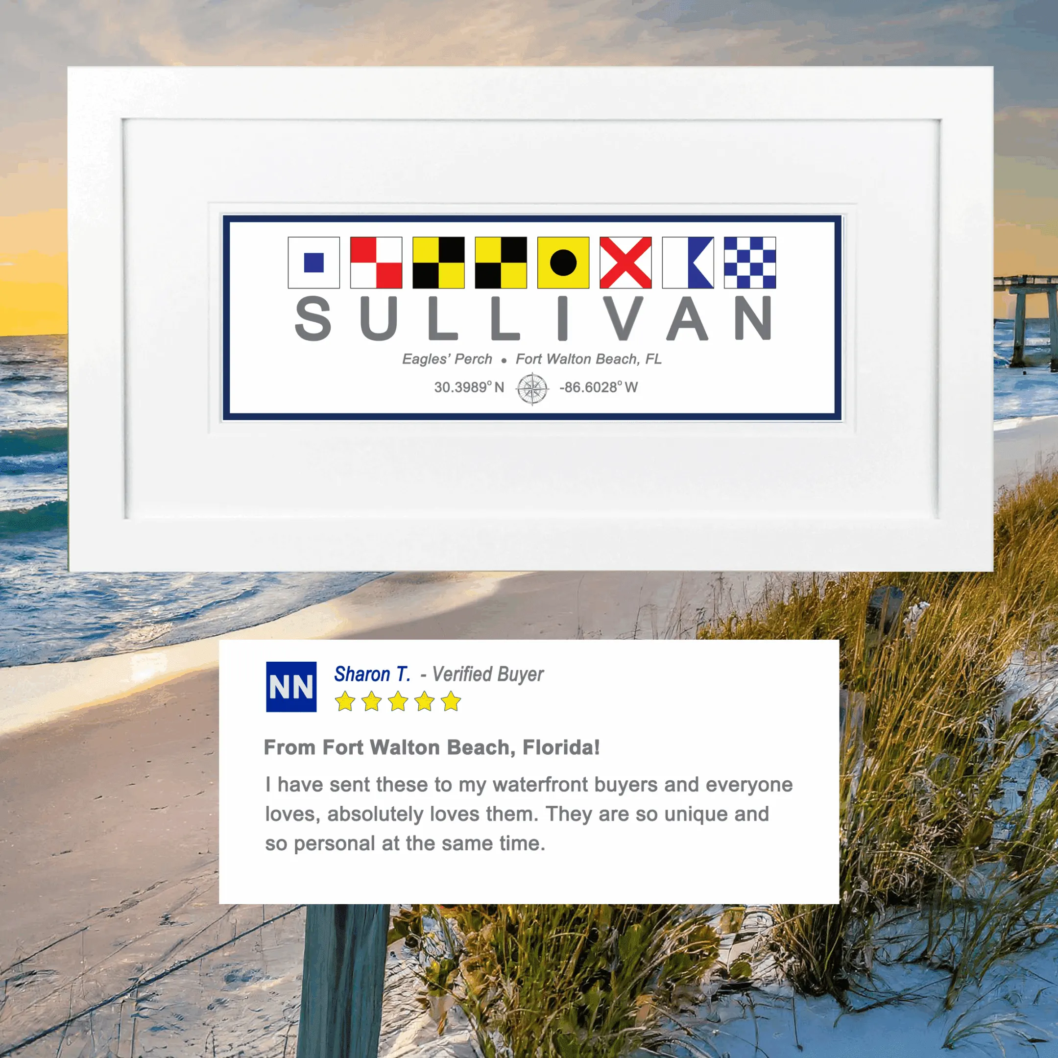 Create a one-of-a-kind personalized nautical flag print to celebrate your special moment or to give a deeply personal, meaningful gift. Browse our product carousel for inspiration and design options. If you want something truly unique, call or text Jim at (610) 703-0645. He'll help you bring your vision to life with a custom nautical flag wall art that reflects your story.